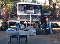 Började med att ta fram campingbord stolar, solstolen med tillbehör samt de tre solskydden för däckena på vänstersidan, som har mest sol.