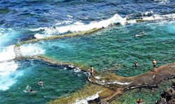 Vi ställde oss bara bland de andra bilarna i kön. Nära in till byn och nära till stranden. Här finns det förutom underbara badställen dusch och toa. En klar förbättring. Svettas idag. Blåser nästan inget och då sticker tempen upp direkt. Lite tunna moln som gör att det inte blir hysteriskt hett. Men det finns bot. En hel sval Atlant. Där är vi efter jag skrivit klart.